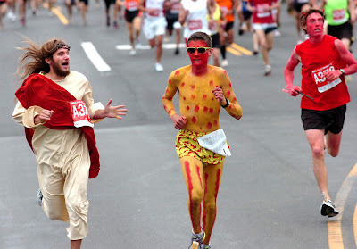 I sat and stood outside the apartment from 7 a.m. until 11:30 a.m. yesterday, yelling for the participants in the Bolder Boulder. The apartment driveway where I stand is 1/4 mile from Folsom Field; once inside the stadium, they have to make one lap of the track inside and they hit the finish line. I'm rotten, I guess.... I stand there and yell that there's only "a quarter-mile to go!" and "You can do it!" I was shocked that over 50 people stopped by (after they had finished their run) and thanked me for cheering them on - a lot of the women racers hugged me, and many said they don't think they would have finished if they hadn't heard me yell that there was only a quarter-mile left. My psychiatrist ran yesterday, and remembers hearing me yelling; I saw both Jim and Kathy run by; and the entire Chandler family went by as well.... other than that, there were ROTC squads, a herd of Chick-Fillet cows wearing "Eat Mor Chikin" signs, several parrots, a wonderful Uncle Sam, Batman and Robin, men in kilts, men in sequined majorette uniforms, several men in towels (with Run Naked painted on their chests and backs), a red devil, a Jesus, a gorilla carrying a man in a cage, several bananas, Pac Man, ballerinas, mariachis ... it was quite an entertaining crowd. More than 58,000 folks entered the race, and almost 54,000 completed it. The fastest running time was by a young man (28) from Evergreen, who finished the 10 K run in less than 30 minutes and 30 seconds.